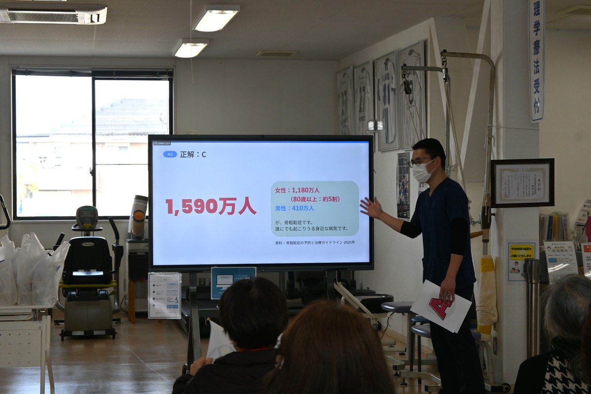 説明会では、骨粗しょう症の基礎知識や発症リスクについて、クイズ形式を交えながら分かりやすく解説いたしました。骨粗しょう症は自覚症状が少ないことも多く、早期の確認が重要であることをお伝えしました。
